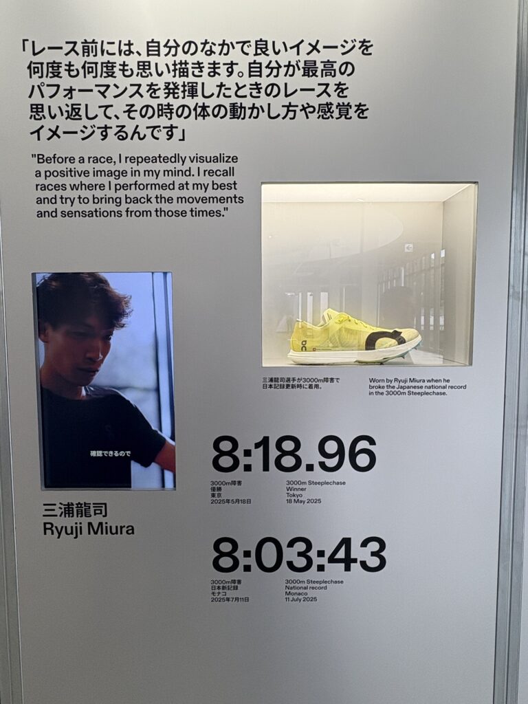 東京世界陸上期間中の限定イベントである”on labs tokyo”内で展示されていた三浦龍司選手が3000mSCで日本記録を樹立した際に着用していたスパイクもダブルアイレットをしていた形跡がありました。