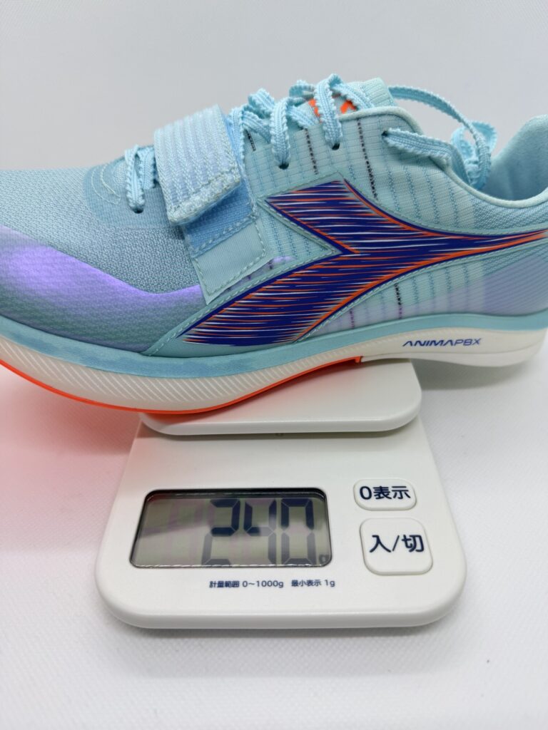 LUNGO CARBON Wの重さは25.5cmのピンを外した状態で”240g“でした。幅跳びスパイクにしては結構重めな方で、三段跳スパイクだと考えるとまあ妥当くらいな感じです。